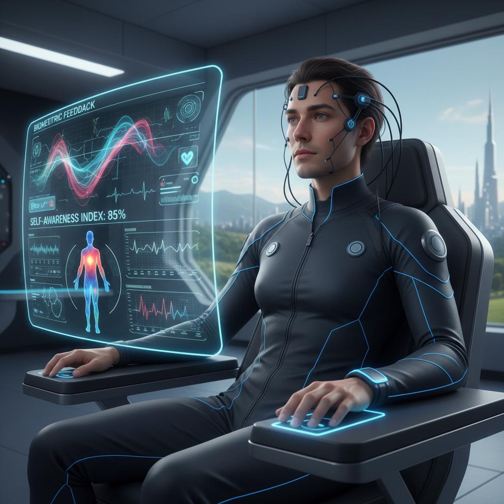 Image: AI assistant analyzing biometric feedback; Alt text: AI-powered self-awareness device in use