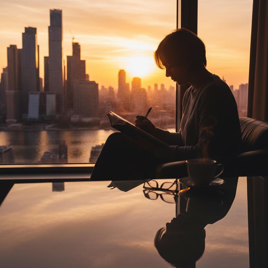 Image: Person journaling alone at dusk, cityscape in background; Alt text: Reflective individual journaling at sunset, urban skyline