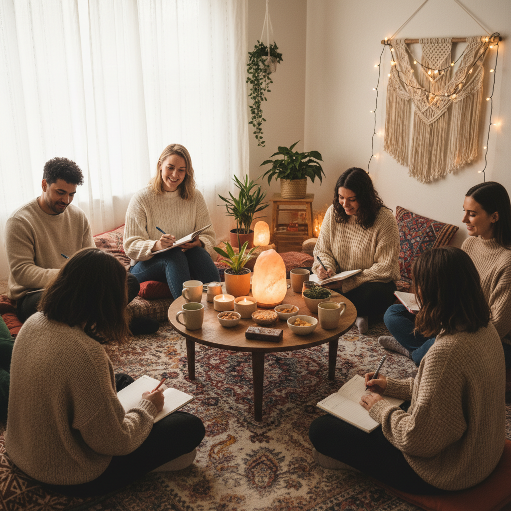 - Priya (group): Attends weekly journaling circles and shares progress in an online community.