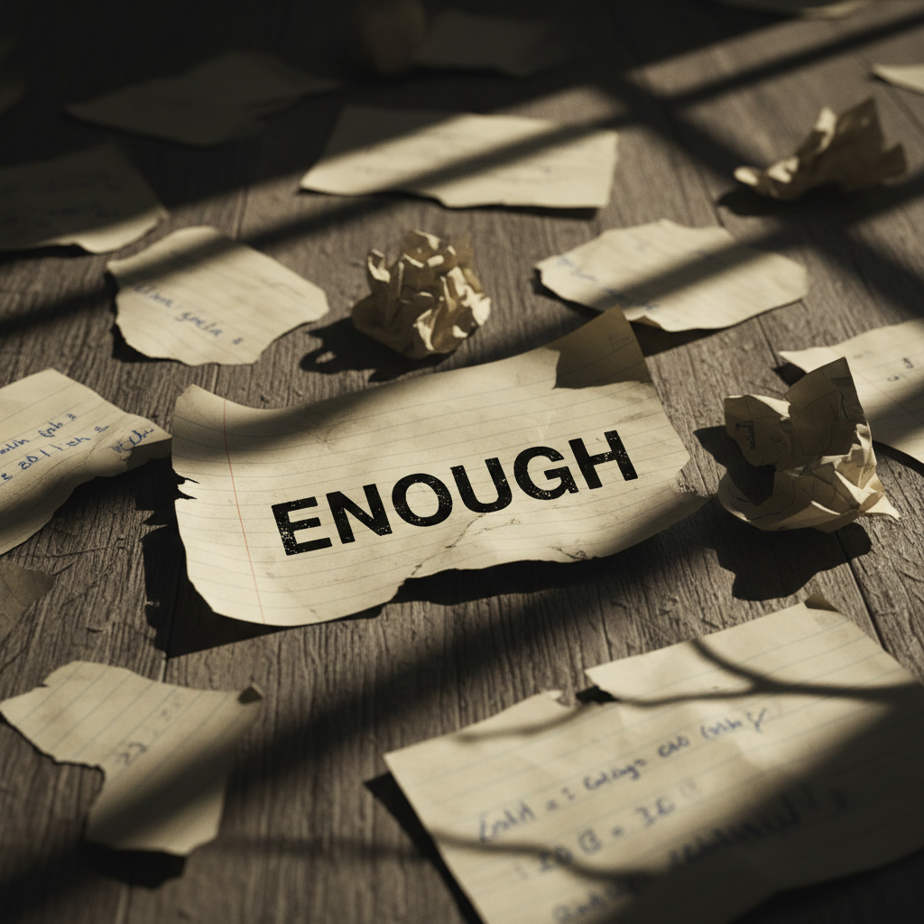 Alt text: Torn journal pages with the word 'Enough' sharply in focus, symbolizing emotional growth through radical journaling