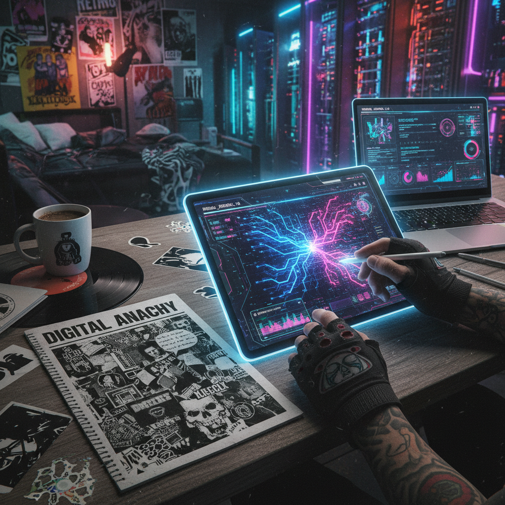 Alt text: Energetic collage of punk zines, digital journaling devices, and AI interfaces, representing the evolution of journaling for self-awareness.