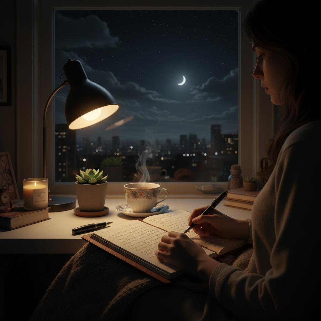 Photo: A person journaling at night by lamplight, capturing the ritual of nightly emotional reflection.