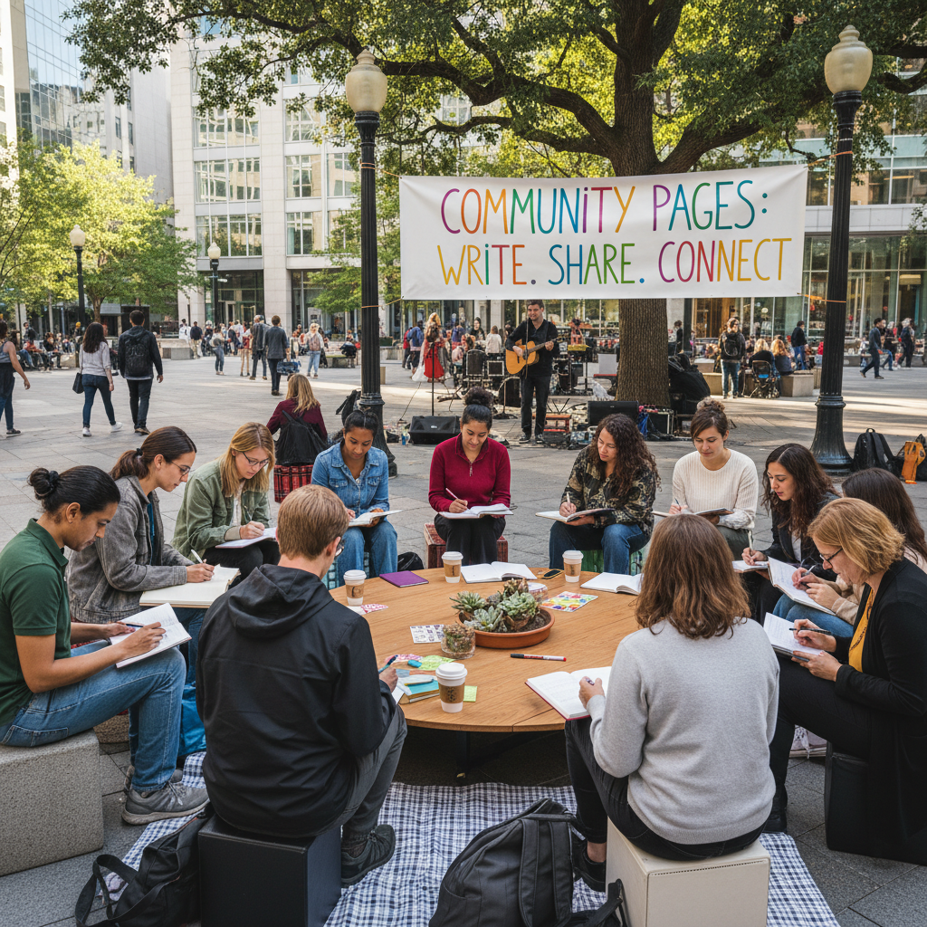 Alt text: Group journaling in a public space, diverse participants, illustrating the community impact of shared reflective practices.