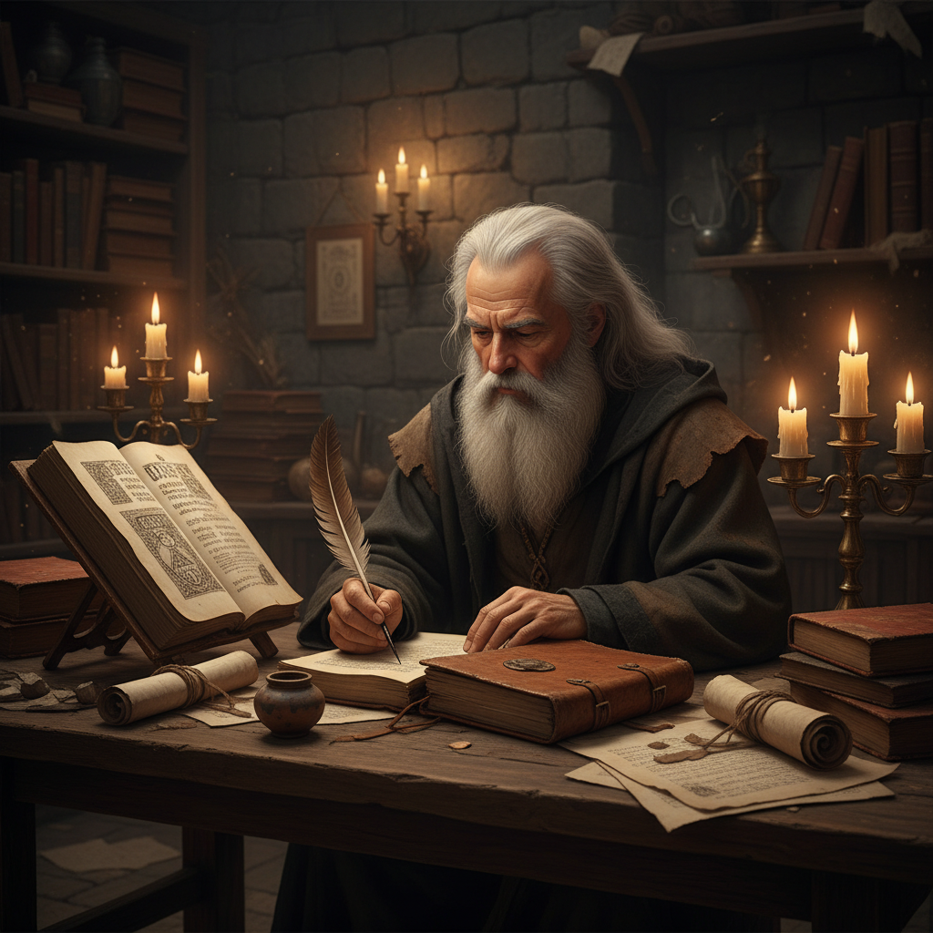 Ancient philosopher writing by candlelight, reflecting on self-growth centuries before TikTok therapy.
